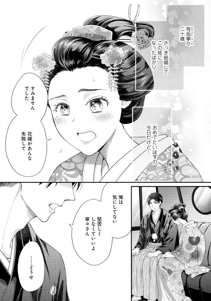 時は大正。貧乏士族・寧々は町でナンパにあっていたところを、美しい軍人の男に助けられる。「もっと話していたかったな」彼女がそう思いながら帰宅すると、両親から縁談の話が…。寧々は突然の話に戸惑いつつも、両親のために縁談を引き受けることに。当日、気乗りしない彼女の前に現れた結婚相手・隆清は、もう一度会いたいと思っていた「あの軍人さん」で…!?